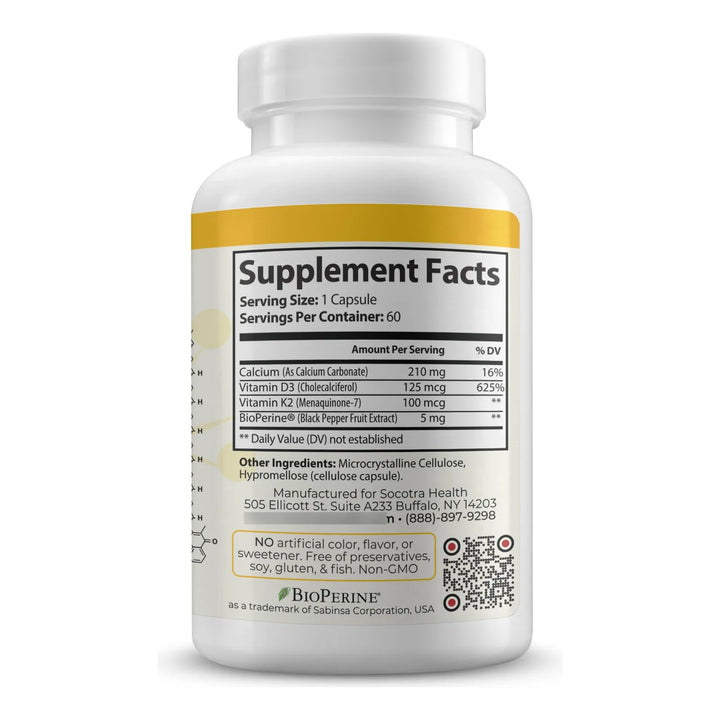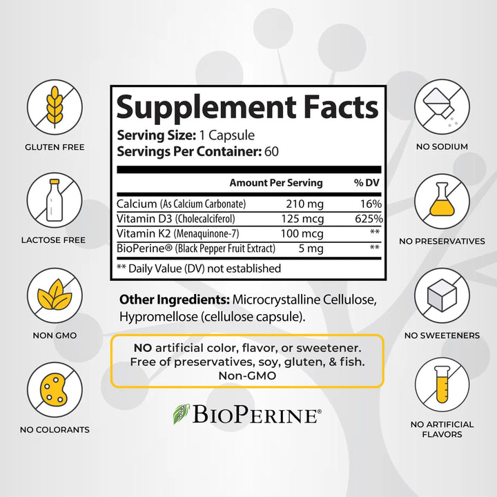 La vitamina D3 es esencial para la absorción de calcio, pero sin la vitamina K2, ese calcio podría depositarse en lugares equivocados, como tus arterias. Aquí es donde nuestro producto marca la diferencia. La combinación única de D3 y K2 asegura que el calcio llegue exactamente donde lo necesitas: tus huesos. Además, con la adición de BioPerine, un extracto natural de pimienta negra, maximizas la absorción de estos nutrientes clave.