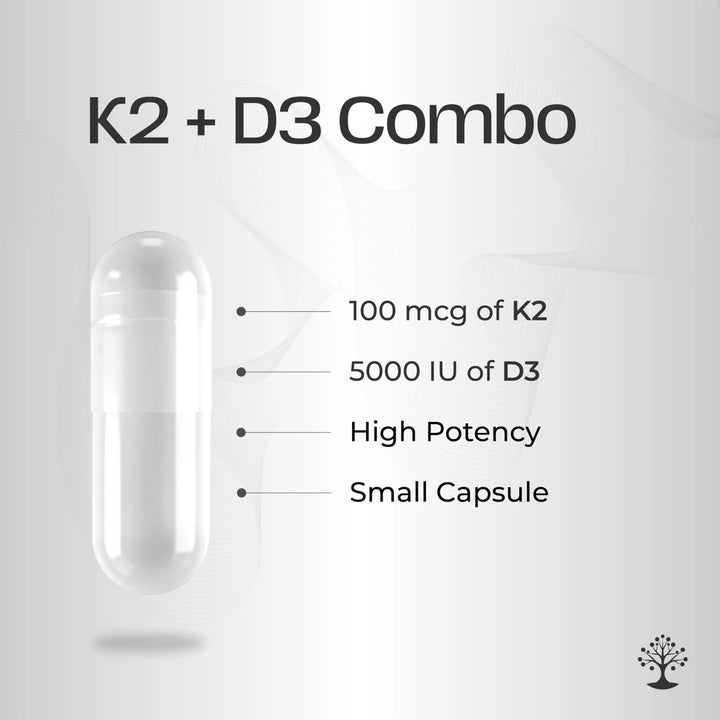 - Alta potencia con 5000 UI de vitamina D3 y 100 mcg de K2 MK7 por cápsula 😊