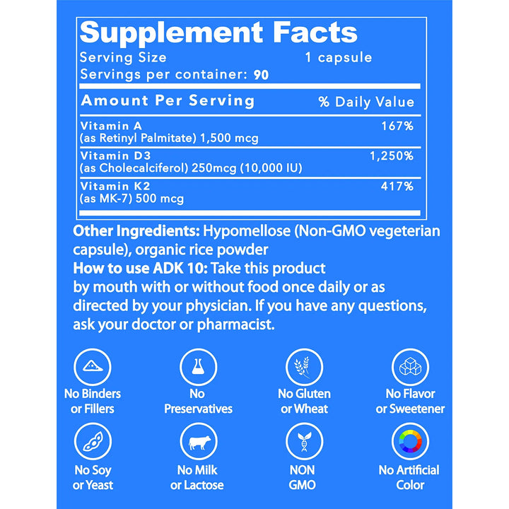 Este potente combo no es solo otro suplemento en el mercado. Cada cápsula está fabricada en Estados Unidos con los más altos estándares de calidad, probada rigurosamente para garantizar su pureza y efectividad. ¿Sabías que la vitamina D3 y K2 trabajan juntas para mejorar la absorción de calcio y fortalecer tus huesos? Además, la vitamina A contribuye a la salud de tus ojos y dientes, completando un trío de nutrientes esenciales para tu cuerpo.