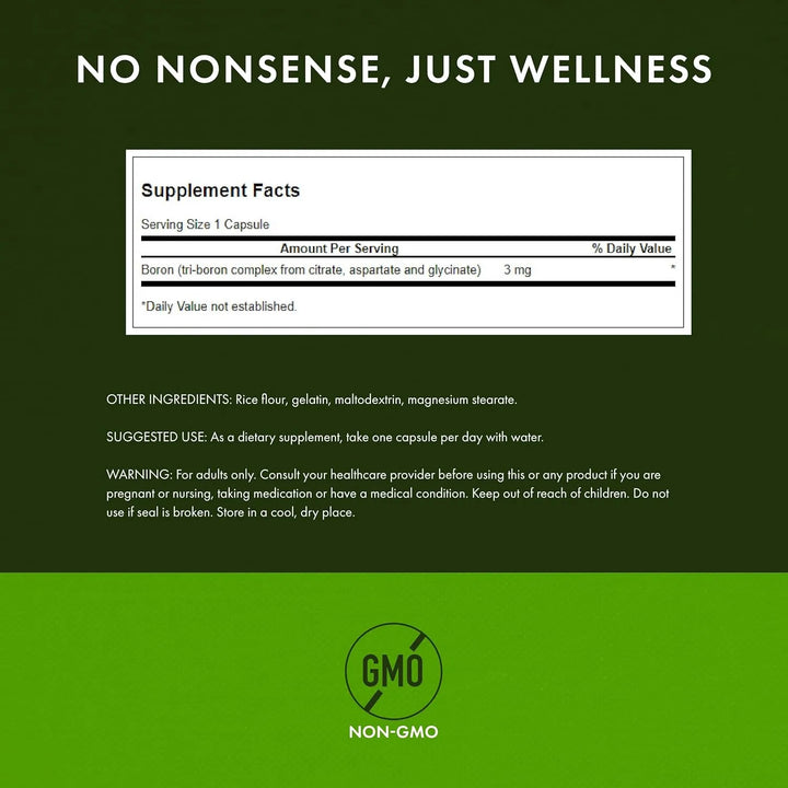 Swanson no es una marca cualquiera. Con casi 50 años de experiencia en el mercado, ha perfeccionado una fórmula que combina tres formas biodisponibles de boro: citrato, aspartato y glicinato. Esta combinación única asegura que tu cuerpo absorba hasta la última molécula de este mineral esencial, maximizando sus beneficios. Además, al ser un producto de espectro completo, garantizamos que solo recibas ingredientes vegetales sin procesamientos innecesarios, tal como la naturaleza lo diseñó.