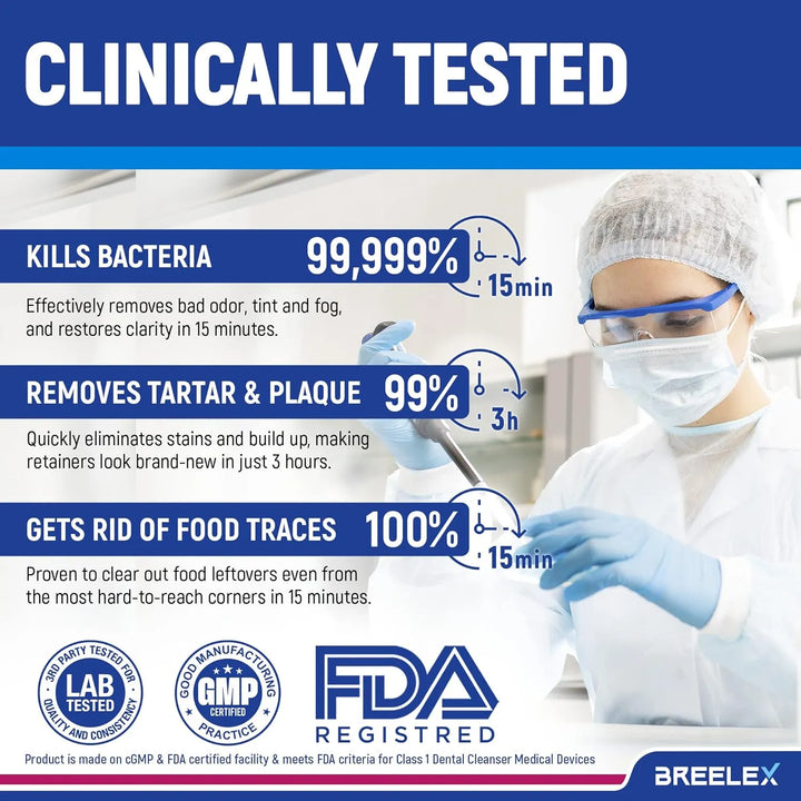 Imagina despertar cada mañana con un protector bucal que luce como nuevo, libre de sarro y malos olores. Con Breelex, eso es posible. Nuestra fórmula potente y segura actúa en solo 3 minutos, eliminando incluso las manchas más rebeldes. Además, al estar aprobadas por FSA/HSA, puedes comprarlas con tus fondos de salud, haciendo que el cuidado dental sea más accesible que nunca.