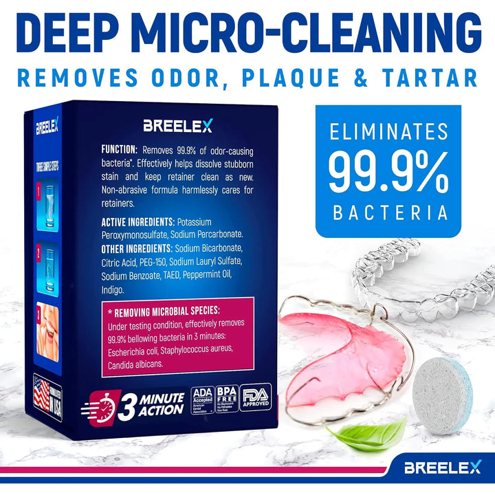¿Cansado de luchar contra las manchas difíciles y los malos olores en tus aparatos dentales? Las tabletas limpiadoras de dentaduras Breelex son la solución definitiva para mantener tus retenedores, protectores bucales y alineadores impecables, sin esfuerzo. Diseñadas por profesionales dentales en Estados Unidos, estas tabletas no solo eliminan el 99.9% de las bacterias, sino que también prolongan la vida útil de tus dispositivos, garantizando una higiene óptima y un brillo duradero.