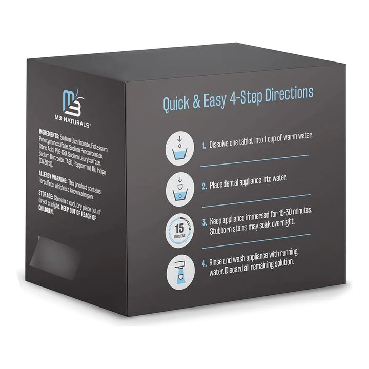 Las tabletas de M3 Naturals contienen ingredientes activos que atacan directamente la placa bacteriana, las manchas y los olores. Al disolverse en agua, liberan oxígeno activo que penetra en cada rincón del aparato dental, desintegrando residuos sin dañar el material. Es como llevar un limpiador ultrasónico a tu hogar, pero sin el precio exorbitante.