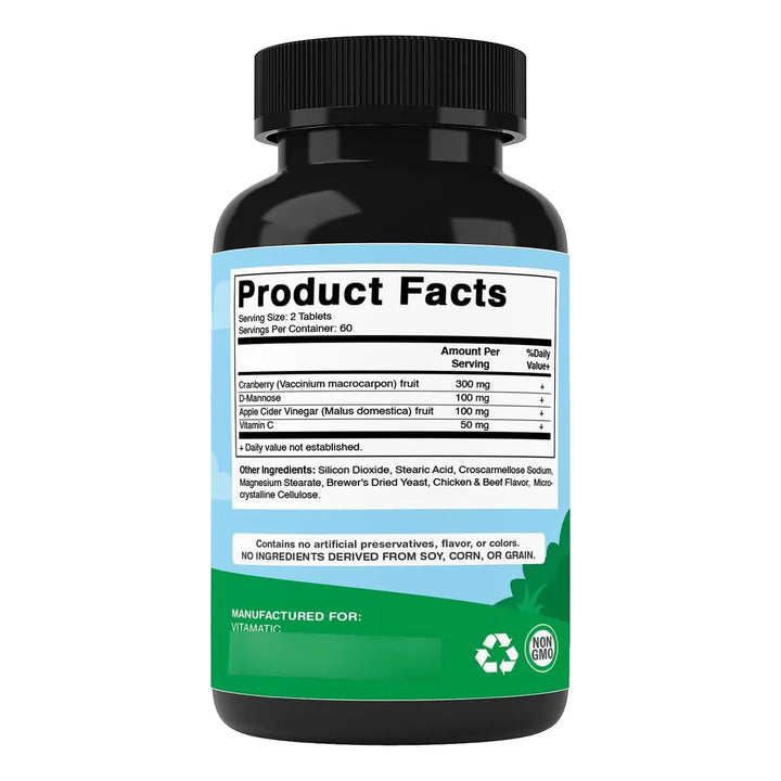 ¿Tu perro sufre de infecciones urinarias recurrentes o molestias al orinar? Las Tabletas Masticables Arándano con D-manosa y Sidra de Manzana son la solución natural que estabas buscando. Formuladas con ingredientes clínicamente respaldados, estas deliciosas tabletas no solo protegen su tracto urinario, ¡sino que también les encantarán por su sabor a pollo y carne!