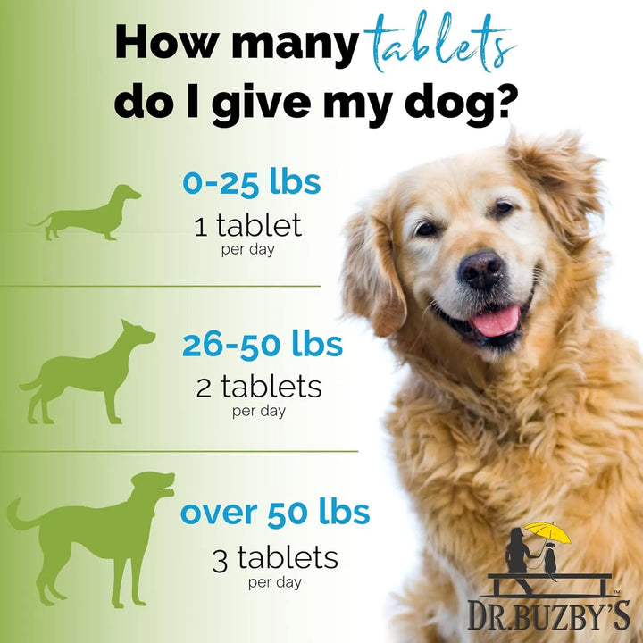 - Determina la dosis según el peso de tu perro (1 tableta para menos de 25 lbs, 2 para 26-50 lbs, 3 para más de 50 lbs).