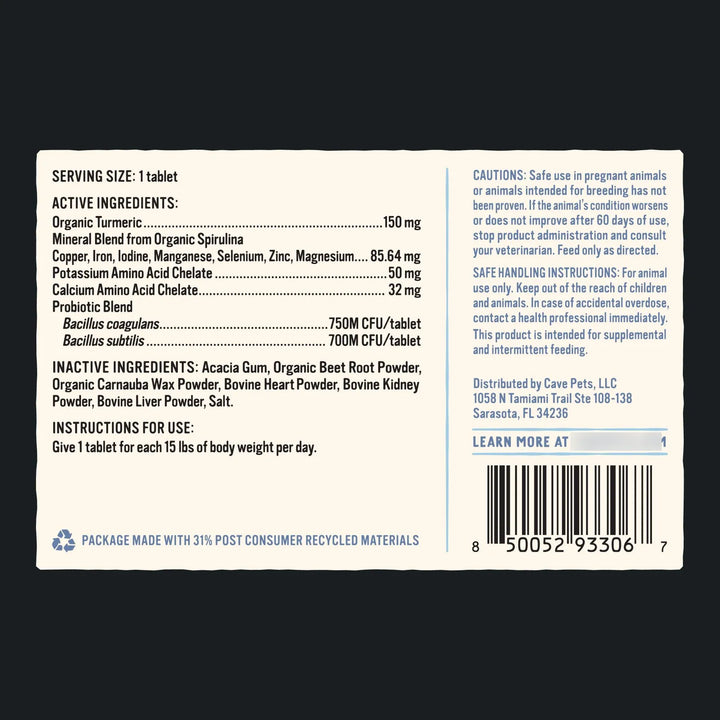 Imagina poder ofrecerle a tu compañero peludo un suplemento que no solo alivie sus molestias digestivas, sino que también fortalezca su sistema inmunológico y le brinde energía duradera. Con ingredientes como cúrcuma orgánica, carnes de órganos ricas en nutrientes y una potente mezcla probiótica de 1450 M UFC, estas tabletas son el aliado perfecto para su bienestar diario.