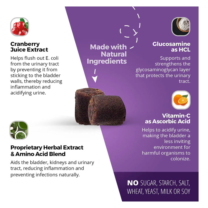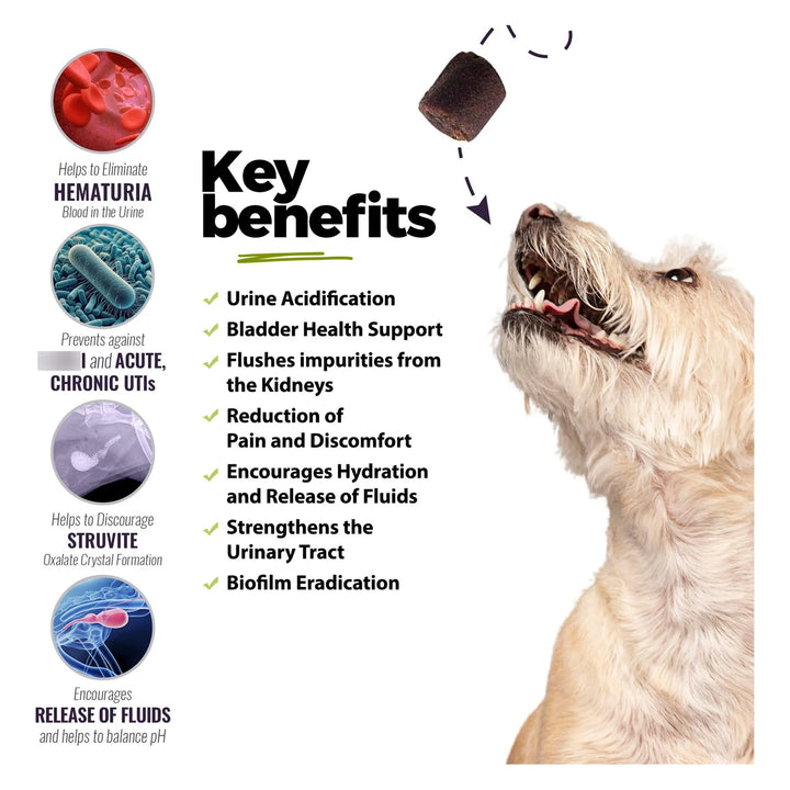 Nuestro tratamiento actúa acidificando la orina de tu perro, lo que ayuda a eliminar bacterias y prevenir infecciones. Los antioxidantes naturales fortalecen el sistema urinario, mientras que la glucosamina y la vitamina C nutren el revestimiento del tracto urinario. El resultado es una vejiga y riñones más saludables, y un perro más feliz.