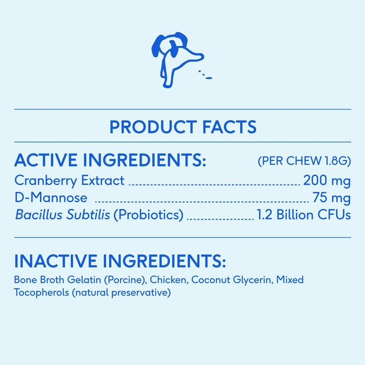 Los arándanos contienen proantocianidinas (PACs) que evitan que las bacterias E.coli se adhieran a las paredes de la vejiga. La D-Manosa actúa como un imán natural para estas bacterias, ayudando a eliminarlas a través de la orina. Los probióticos mantienen un equilibrio bacteriano saludable en todo el sistema urinario. Juntos, estos ingredientes crean un entorno hostil para las infecciones mientras fortalecen las defensas naturales de tu mascota.