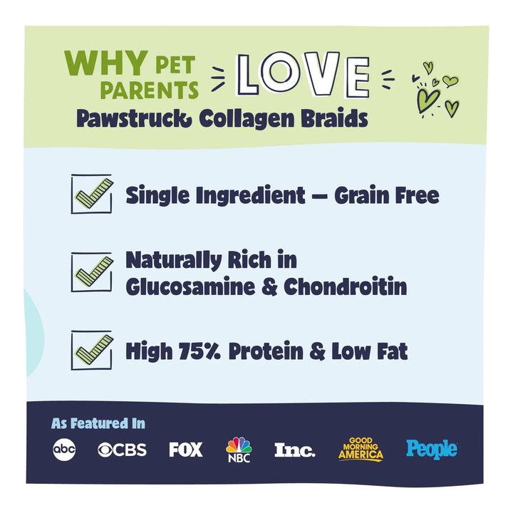 Las trenzas de colágeno actúan como un cepillo de dientes natural, eliminando residuos y masajeando las encías durante la masticación. El colágeno nutre las articulaciones y promueve una digestión saludable, mientras que la condroitina y glucosamina apoyan la movilidad. ¡Todo en un solo snack!