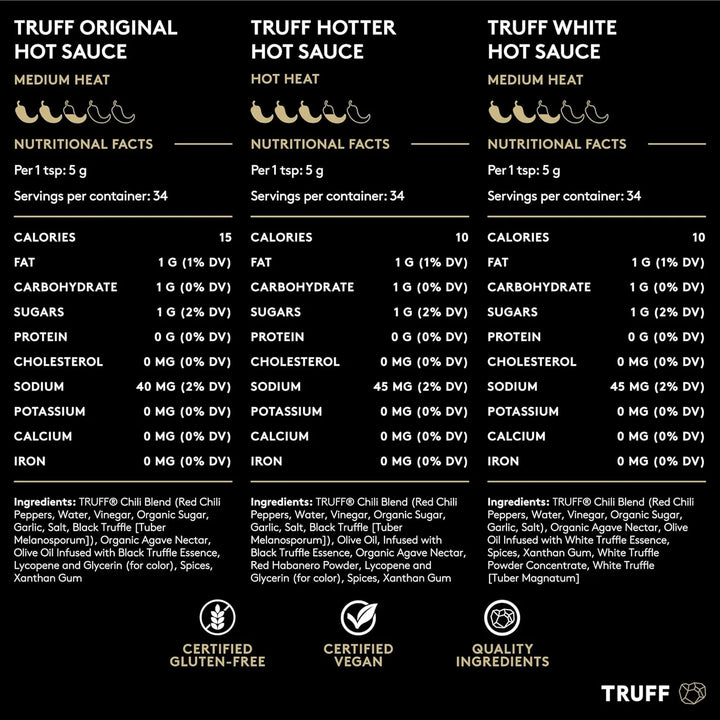 ¿Cansado de salsas picantes genéricas que solo queman pero no saben a nada? TRUFF rompe el molde con su combinación única de ingredientes premium. La edición blanca, con su toque de trufa blanca y cilantro orgánico, ofrece una frescura inigualable, mientras que la versión más picante satisface incluso a los amantes del calor intenso. Este juego de 3 botellas es tu pasaporte a un mundo de sabores audaces y sofisticados.