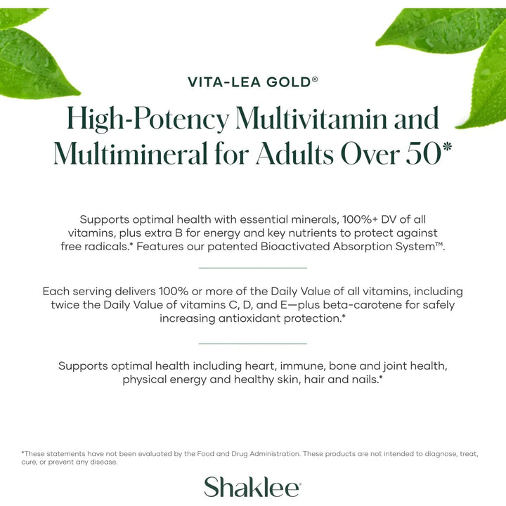 Diseñado específicamente para adultos mayores de 50 años, esta fórmula de alta potencia aborda los desafíos únicos que enfrentas con el paso del tiempo. ¿Notas que tu cuerpo ya no absorbe los nutrientes como antes? Vita-Lea Gold está clínicamente formulado para maximizar la absorción, entregándote más del 100% del valor diario de vitaminas esenciales como C, D y E, junto con nutrientes clave para tu corazón, huesos y sistema inmunológico.