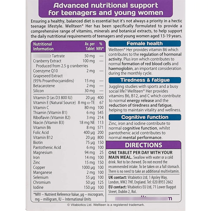 ¿Sabías que la adolescencia es una de las etapas más demandantes para el cuerpo? Entre el crecimiento acelerado, los cambios hormonales y las actividades diarias, las jóvenes necesitan un apoyo nutricional que les permita mantenerse fuertes, enfocadas y llenas de energía. Wellteen Her está diseñado específicamente para chicas de 13 a 19 años, brindando una combinación única de vitaminas, minerales y extractos naturales que cubren sus necesidades diarias y promueven un desarrollo saludable.