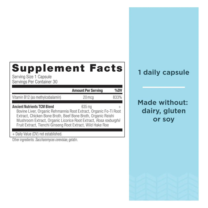 La vitamina B12 metilada actúa directamente en la producción de energía celular, ayudando a convertir los alimentos en combustible utilizable. Las hierbas adaptogénicas como Fo-Ti y Rehmannia trabajan sinérgicamente para ayudar a tu cuerpo a manejar el estrés físico y mental, mientras que los nutrientes ancestrales como el hígado bovino proporcionan cofactores esenciales para un metabolismo óptimo.