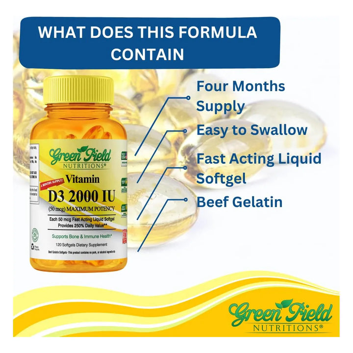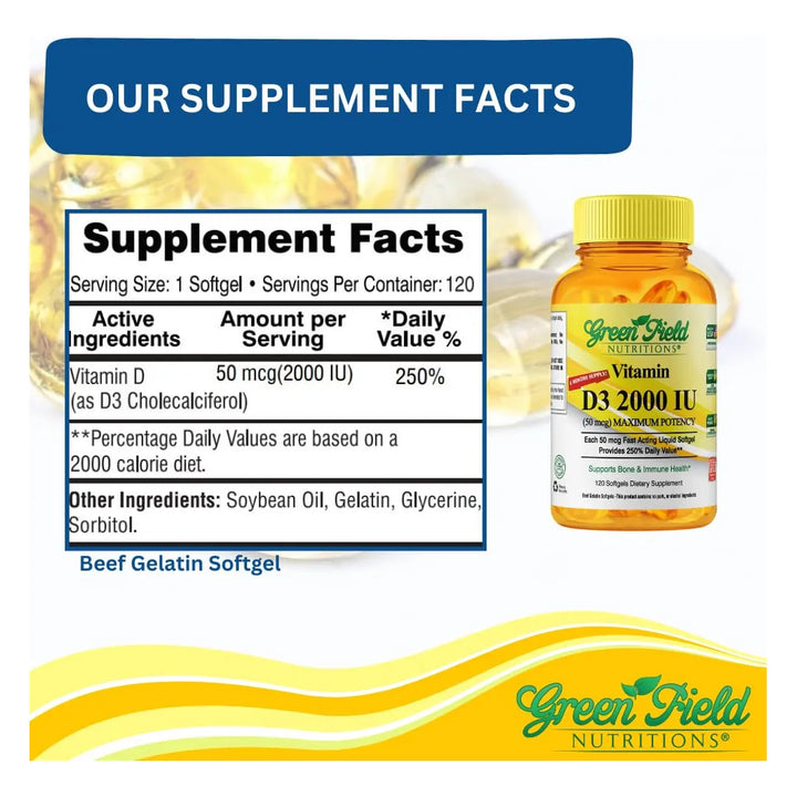 ¿Sientes que tu energía no es la misma? ¿Te preocupa tu sistema inmunológico o la salud de tus huesos? La vitamina D3 es esencial para mantener tu cuerpo fuerte y saludable, pero no todos los suplementos son iguales. Nuestra Vitamina D3 de 2000 UI, en cómodas cápsulas blandas, está diseñada para ofrecerte los máximos beneficios con la mayor comodidad.