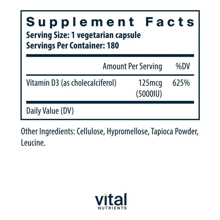 La vitamina D3 es la forma más activa y fácil de absorber de este nutriente vital. Nuestro suplemento está diseñado para brindarte 5000 UI (125 mcg) por cápsula, cubriendo el 625% de tu valor diario recomendado. Sin gluten, lácteos o soja, es la opción perfecta para quienes buscan una fórmula limpia y pura.