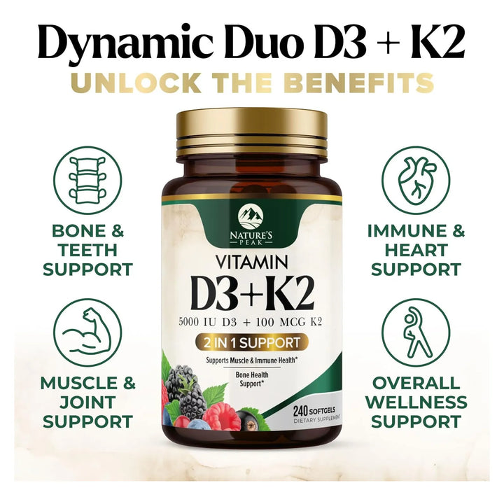 - Huesos Fuertes y Articulaciones Flexibles 💪: La combinación única de D3 y K2 asegura que el calcio se absorba correctamente, previniendo problemas óseos.