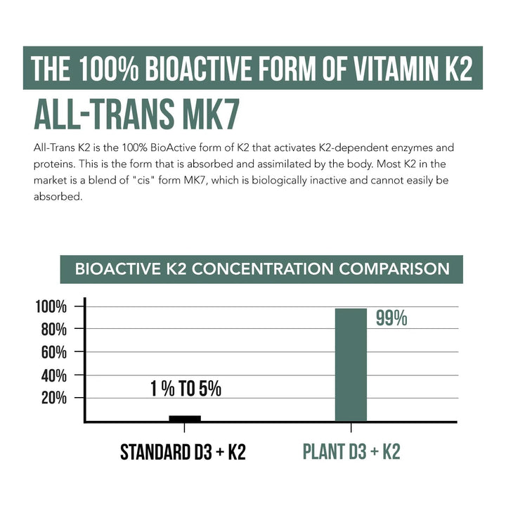 La vitamina D3 es esencial para fortalecer tu sistema inmunológico, mejorar tu estado de ánimo y proteger tus huesos. Pero, ¿qué pasa si te decimos que la mayoría de las fórmulas no incluyen la vitamina K2 necesaria para dirigir el calcio a donde realmente lo necesitas? Nuestra fórmula combina 10,000 UI de vitamina D3 con 120 mcg de K2 All-Trans MK7, la forma más activa y biodisponible, para garantizar que cada gota trabaje en sinergia con tu cuerpo. No más suplementos que solo llenan espacio en tu alacena.