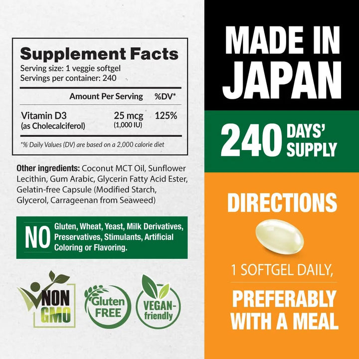 Nuestras cápsulas blandas de origen vegano están creadas para quienes buscan lo mejor en suplementos. Cada dosis contiene 1000 UI de Vitamina D3, extraída de líquenes puros, garantizando un suministro de 240 días en una sola botella. No es solo una vitamina; es una inversión en tu bienestar a largo plazo.