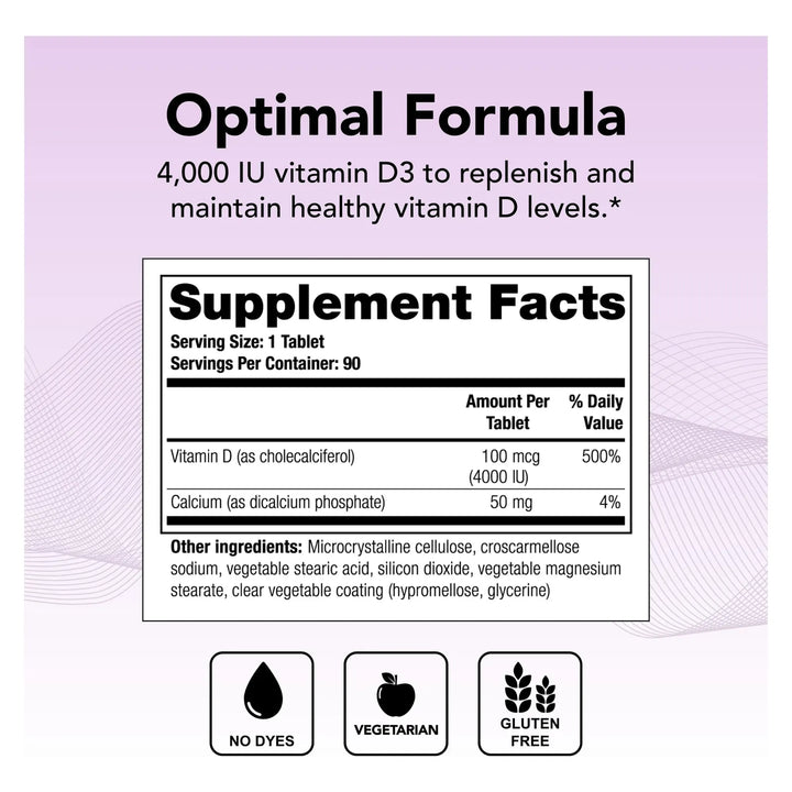 - Dosis óptima de 4,000 UI (100 mcg) por tableta, ideal para adultos que buscan suplir deficiencias. 🌟