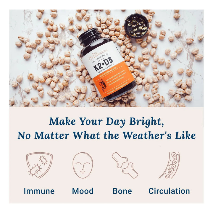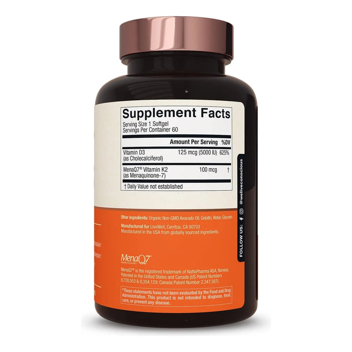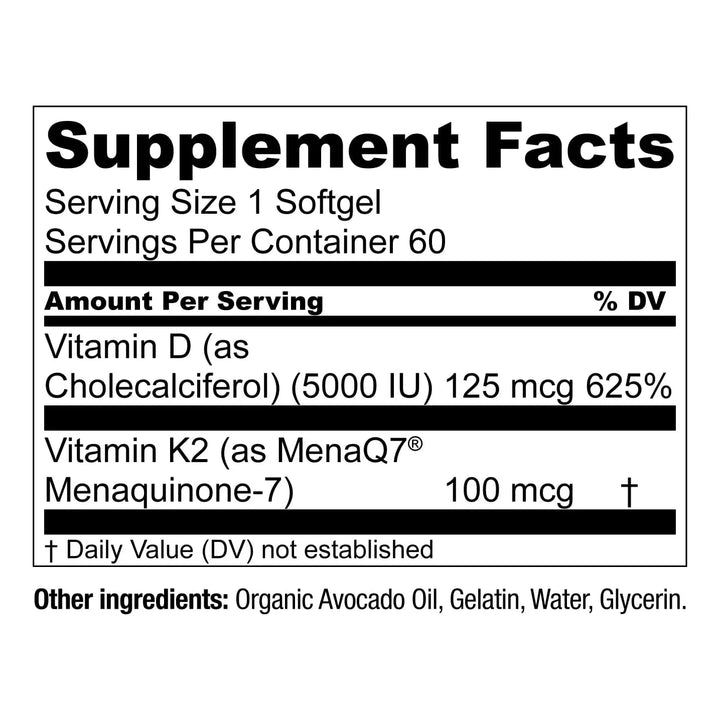 ¿Te preocupa la fragilidad de tus huesos o la salud de tu corazón? No estás solo. Muchas personas luchan con estos problemas, pero pocas conocen la poderosa combinación de la vitamina K2 y D3. Nuestro producto no solo te ofrece estos nutrientes esenciales, sino que lo hace en la dosis perfecta para maximizar sus beneficios. Con 5000 UI de vitamina D3 y la forma patentada MenaQ7 de vitamina K2, cada cápsula está diseñada para brindarte resultados visibles y duraderos. ¡Tu cuerpo te lo agradecerá!