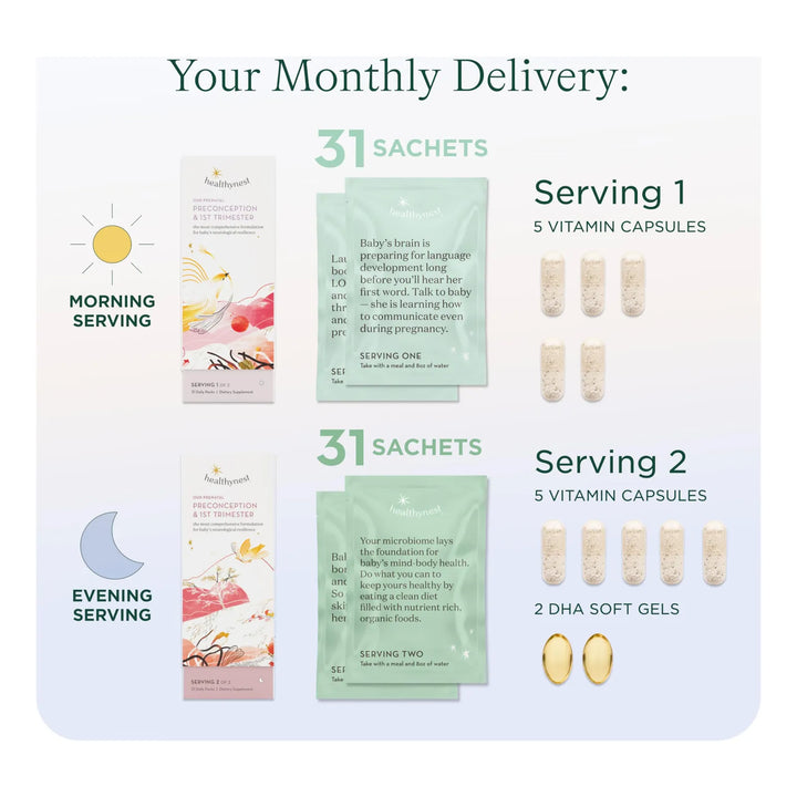 - 💖 Nutrición Trimestral Personalizada: 27 nutrientes que evolucionan con tu embarazo, enfocándose en el desarrollo cerebral fetal en el tercer trimestre.