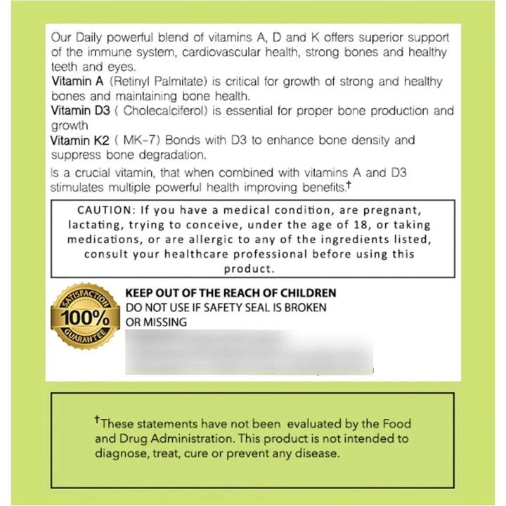 Imagina despertar cada día con la energía y vitalidad de alguien que cuida su cuerpo desde adentro. Nuestro suplemento no solo fortalece tus huesos, sino que también protege tu corazón y refuerza tus defensas naturales. La vitamina D3 asegura que el calcio se absorba correctamente y se dirija a donde más lo necesitas, mientras que la vitamina K2 evita que se acumule en lugares peligrosos como las arterias. La vitamina A, por su parte, actúa como un escudo protector para tus huesos y sistema inmunológico.