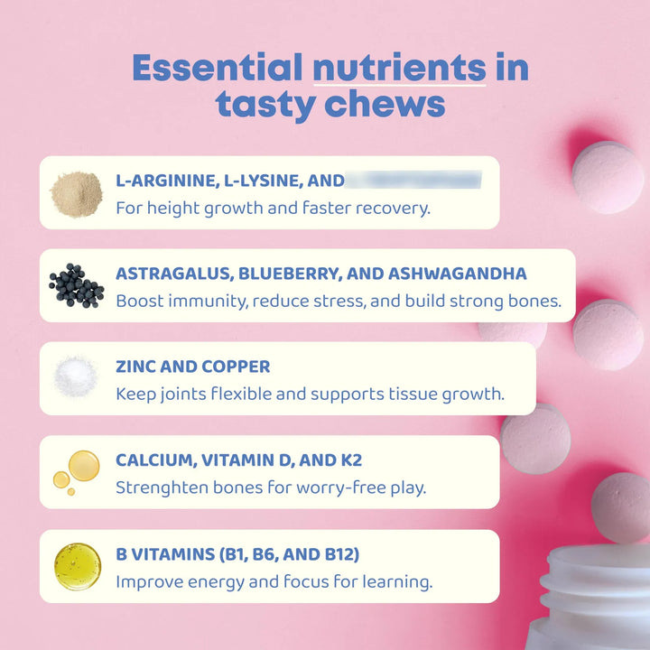 Nuestras vitaminas actúan proporcionando los nutrientes necesarios para estimular la producción de hormona de crecimiento, fortalecer los huesos y mejorar la absorción de minerales. La combinación de L-arginina y L-lisina ayuda a maximizar el potencial genético de altura, mientras que el zinc y la vitamina D aseguran un desarrollo óseo robusto.