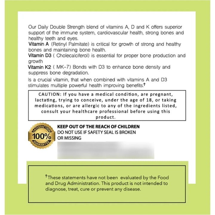 Las Vitaminas ADK 10 actúan de manera sinérgica para potenciar tu salud. La vitamina D3 promueve la absorción de calcio, mientras que la K2 (MK7) dirige este calcio hacia los huesos, evitando su acumulación en arterias. La vitamina A1 complementa este proceso apoyando la visión y la función celular. Juntas, estas vitaminas crean un escudo protector para tu cuerpo.