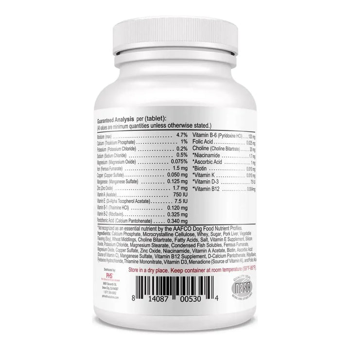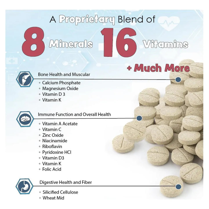 Imagina la tranquilidad de saber que estás protegiendo su sistema inmunológico, fortaleciendo sus huesos y dientes, y apoyando su metabolismo con vitaminas y minerales cuidadosamente seleccionados. Cada tableta está diseñada para perros de todas las razas y edades, porque su salud no puede esperar.