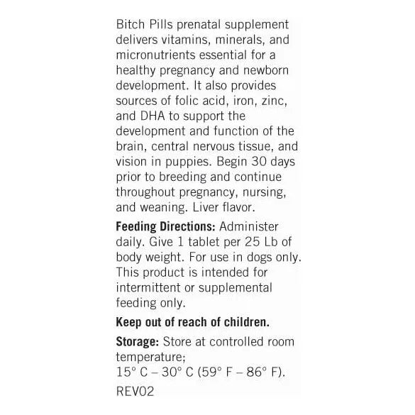 ¿Quieres asegurarte de que tu perra embarazada o en lactancia reciba todos los nutrientes que necesita? Las Vitaminas Prenatales Bitch Pills son la solución perfecta para apoyar su salud y la de sus cachorros. Formuladas con más de 25 años de experiencia, estas vitaminas brindan hierro, ácido fólico y micronutrientes esenciales para un desarrollo fetal saludable y una lactancia óptima.
