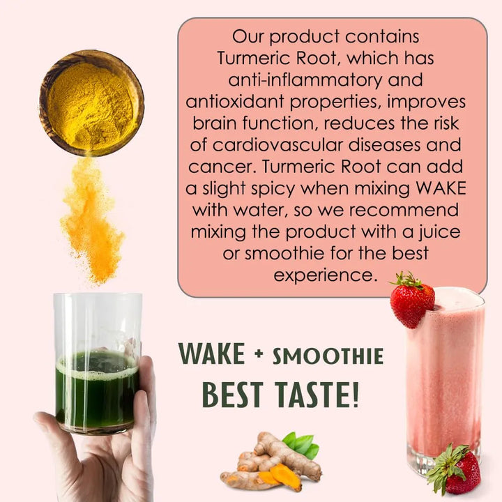 Mezcla una cucharada (10g) de Wake Super Greens con 250ml de agua, jugo o tu batido favorito. Consume preferiblemente por la mañana para comenzar tu día con energía. Para mejores resultados, usa diariamente y mantén una dieta equilibrada.