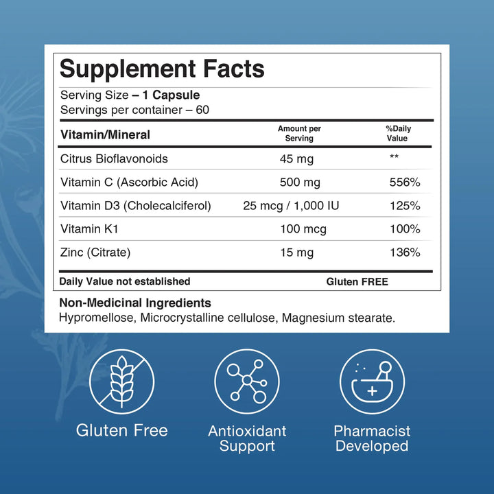 El secreto está en su combinación estratégica de nutrientes. La vitamina K estimula la coagulación sanguínea para reducir el sangrado bajo la piel que causa moretones. El zinc y la vitamina D3 aceleran la reparación celular, mientras el ácido ascórbico fortalece los capilares. Los bioflavonoides mejoran la absorción y potencian los efectos. Es como un equipo de élite trabajando las 24 horas para devolverle a tu piel su estado óptimo.